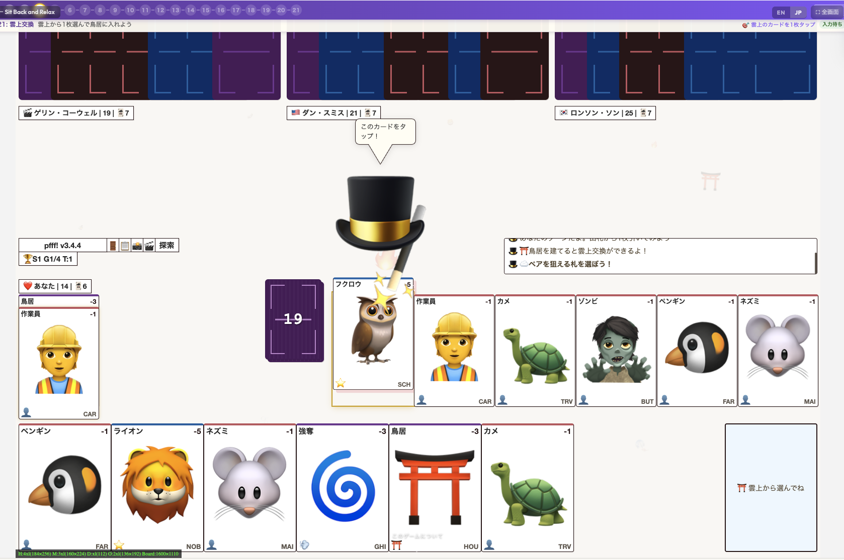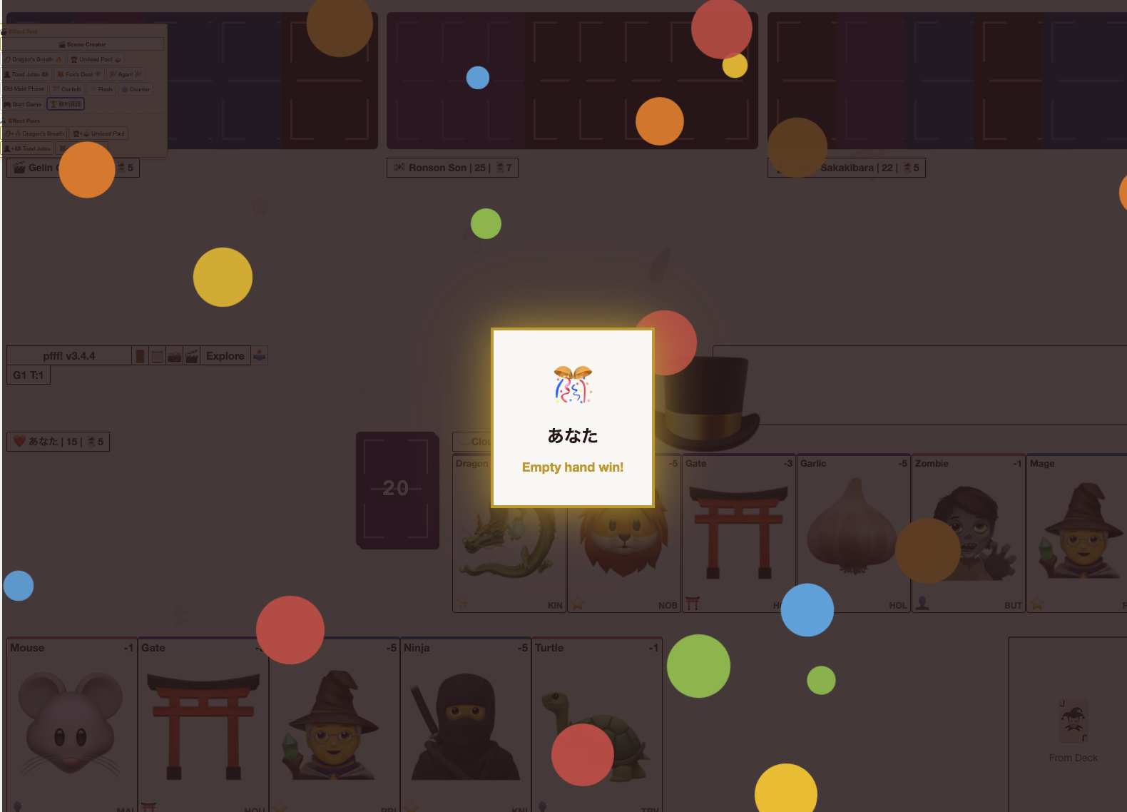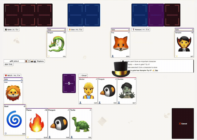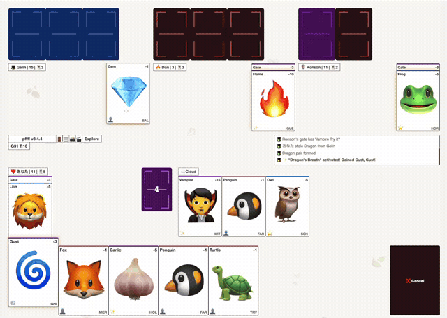 pfff! is a 4-player strategy game where you pair cards, hide your best ones behind Gates ⛩️, and blast open your rivals' defenses with Gust attacks 🌀. Then the deck runs out — and suddenly you're playing Old Maid with a Vampire 🧛 nobody wants.